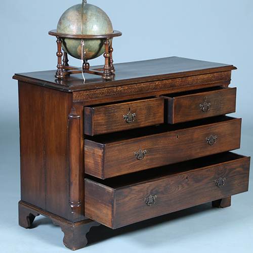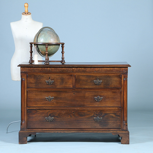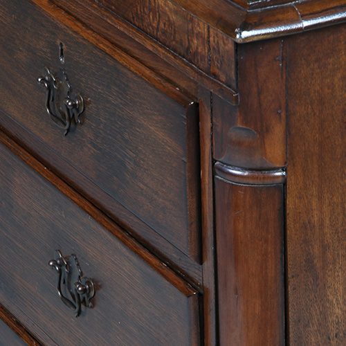 - Eerlijke eenvoudige eikenhouten ladekast of commode met 2 korte en 2 lange laden. Met het bronzen ladentrekkers laten de laden zich gemakkelijk openen. De hoekstijlen met een geïntegreerde kwartronde zuil. Het geheel staand op zogenaamde bracket feet.